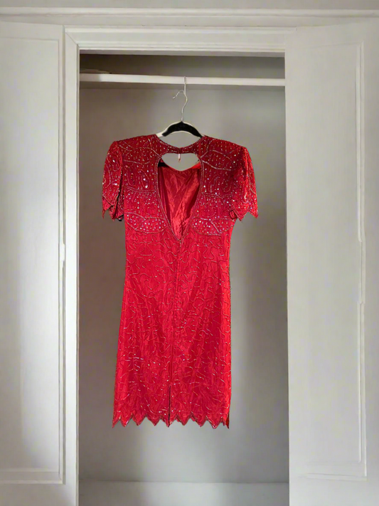 BEADED SEQUINED Party Dress Vtg 70s SILK RED Cocktail Formal Holiday Party sz m