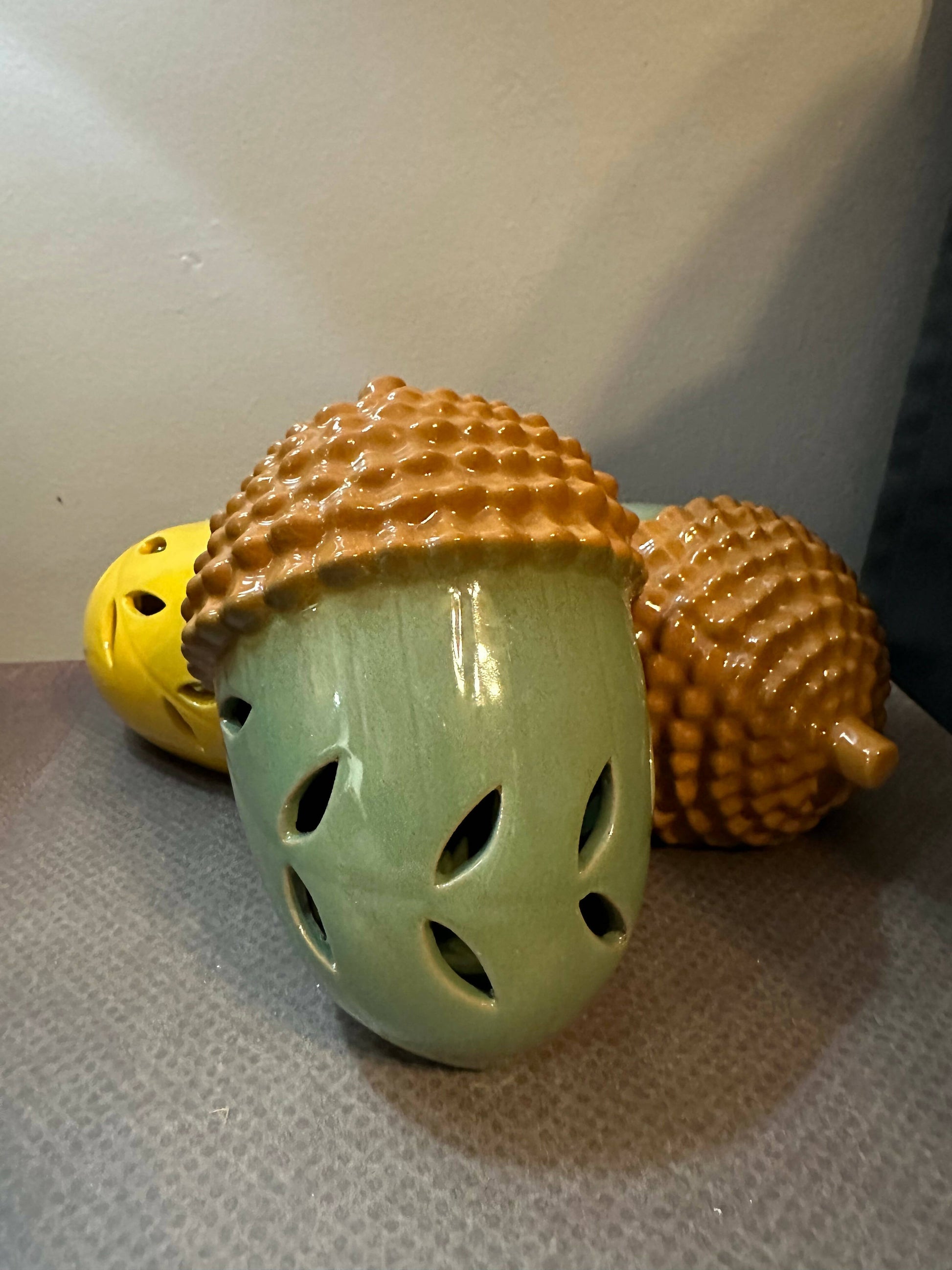 Fall acorn decor, measures approximately 6 X 3 1/2. Choose from two amazing colors of fern green or harvest gold!