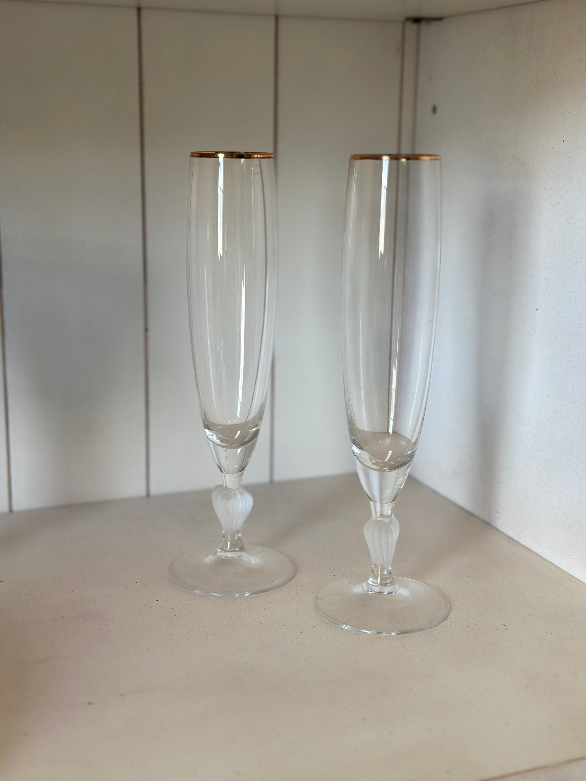 Beautiful champagne flutes. This pair has a pretty little heart at the base of each flute making it perfect for weddings, anniversaries, or just a romantic date night!