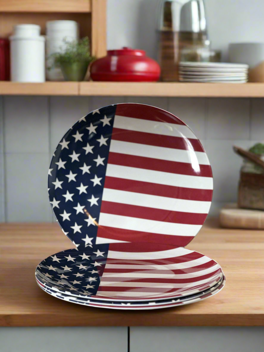 Red, white and blue 4 piece dinner plates. Chip resistant.