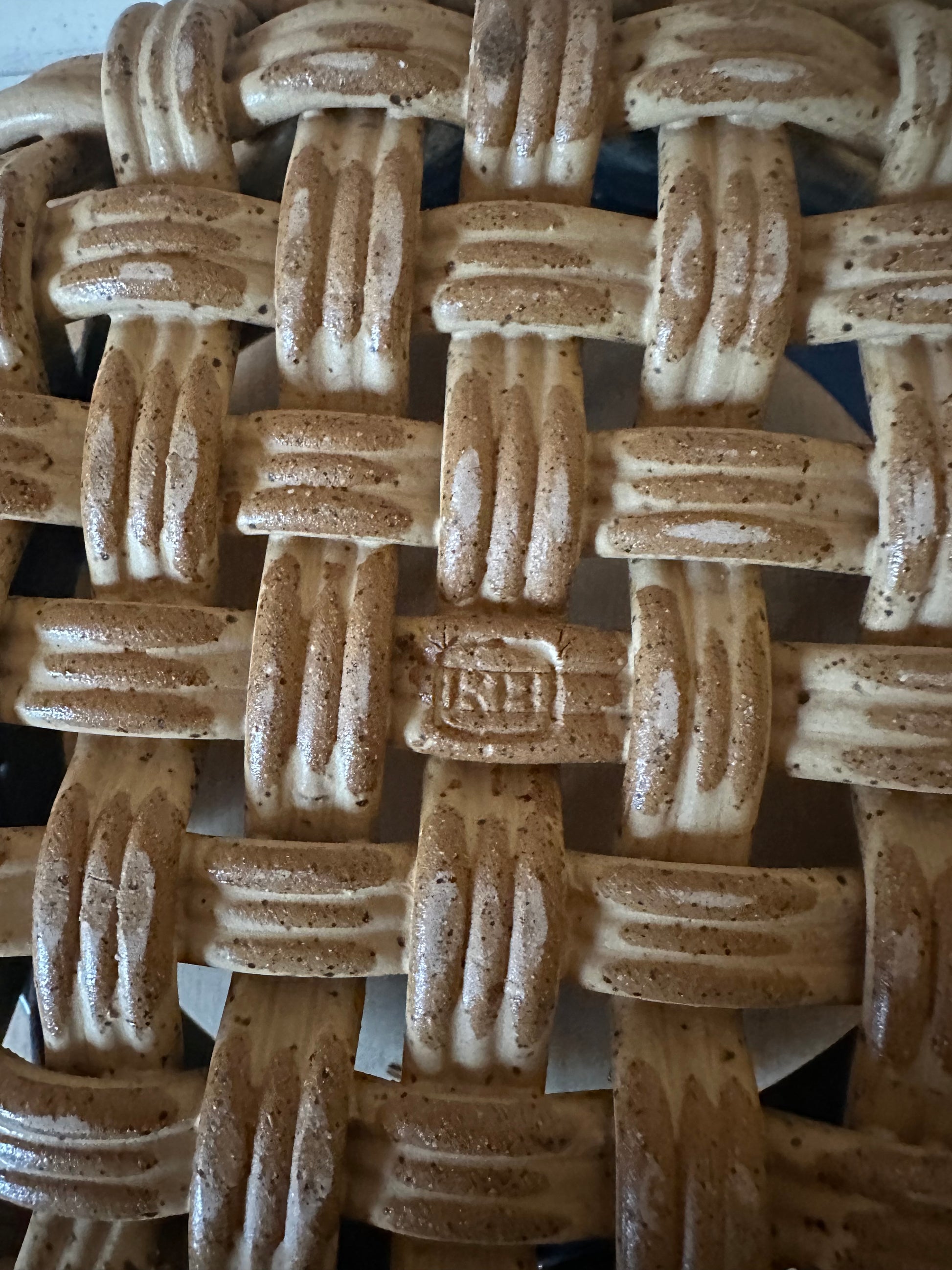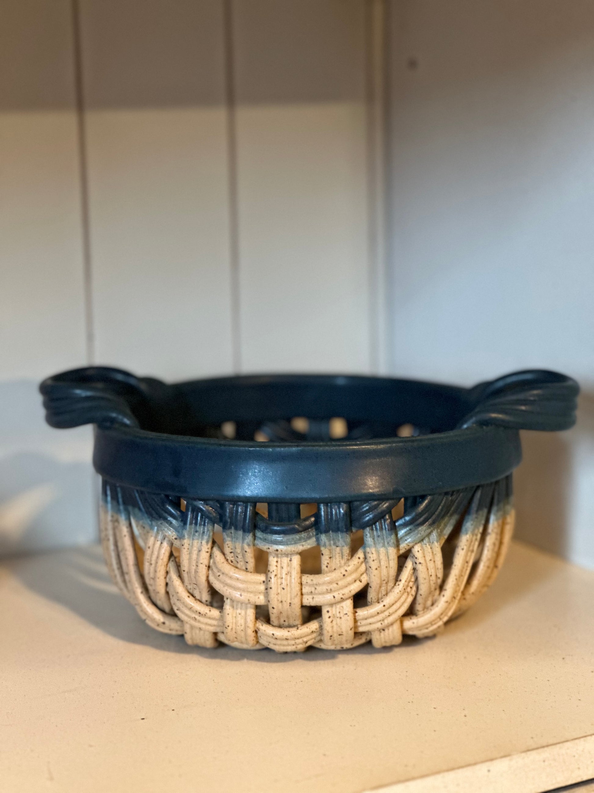 Blue/Speckled Tan and Cream Colored WOVEN CLAY BASKET In Great Condition - NO CHIPS OR CRACKS