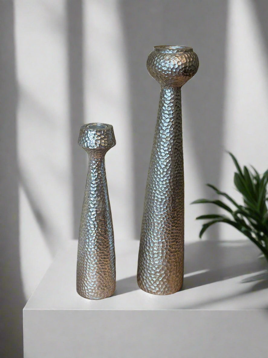 Pair of 14” & 10” silver resin candle holders showcasing a Metallic silver finish adding a modern touch.